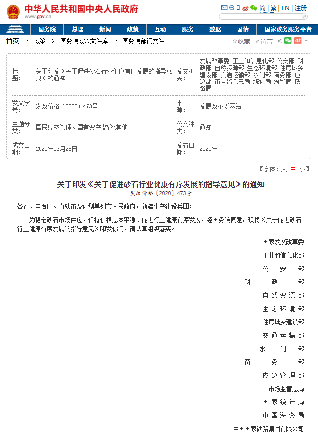 中國政府網第一時間對十五部門和單位聯合印發的《關于促進砂石行業健康有序發展的指導意見》進行全文發布: