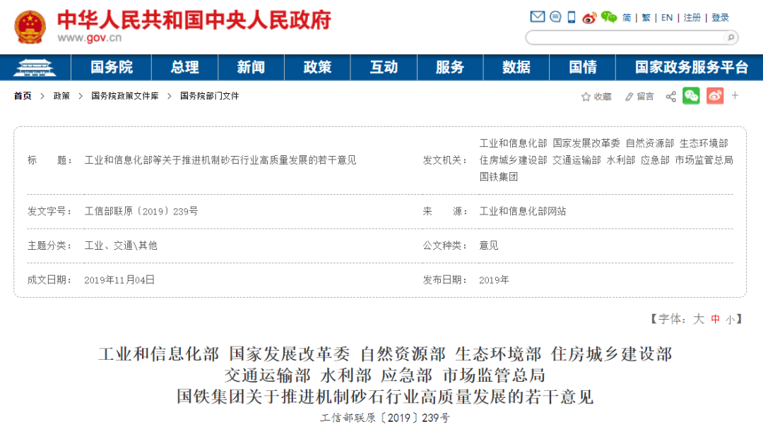 中國政府網第一時間對工業和信息化部與guojia發展改革委、自然資源部、生態環境部等十部門聯合發布的《關于推進機制砂石行業高質量發展的若干意見》進行全文報道:
